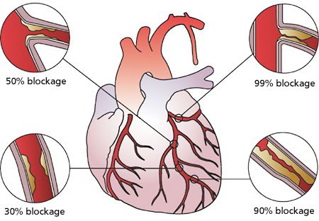 Coronary artery disease develops when your coronary arteries become damaged or diseased. Coronary arteries are major blood vessels that give your heart blood and oxygen. Cholesterol containing deposits (plaque) on your arteries are usually to blame for coronary artery disease. When plaque builds up, this narrows your coronary arteries thereby causing your heart to receive less blood. The decreased blood flow may cause chest pain (angina), shortness of breath or other signs and symptoms. A 100% blockage can cause a heart attack.